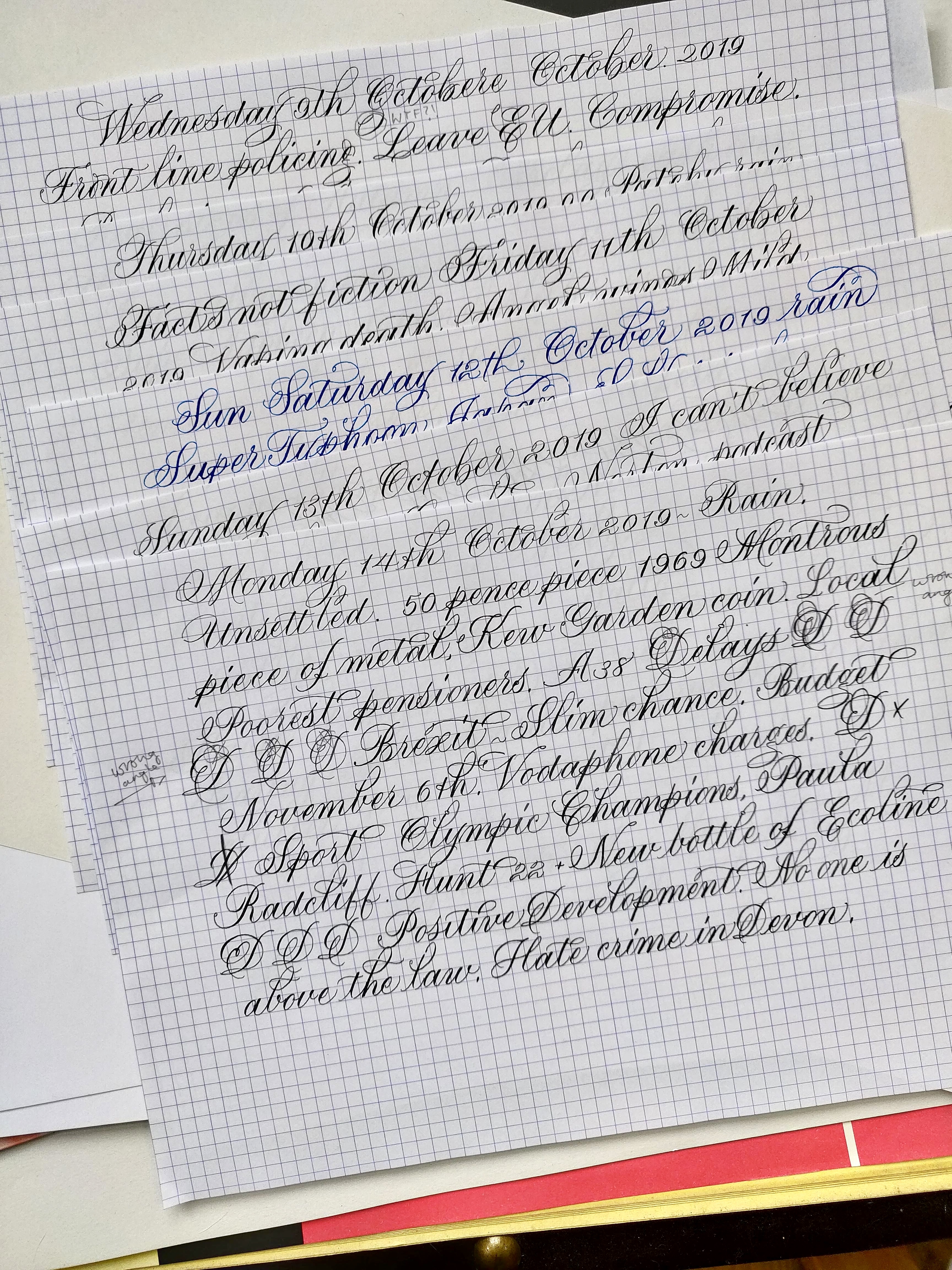 CALLIGRAPHY-PRACTICE-14-10-2019 ← Previous Next → Can’t do ‘D’! copperplate practice sheets using news items I hear in the morning. Share this: Share on X (Opens in new window) X Share on Pinterest (Opens in new window) Pinterest Email a link to a friend (Opens in new window) Email More Share on Facebook (Opens in new window) Facebook Like Loading...